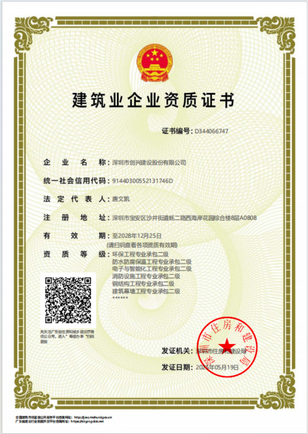 深圳市創(chuàng)興建設(shè)股份有限公司成立於2010年,註冊資金8,000萬元,創(chuàng)興興建的總部位於廣東省深圳市,分公司分別位於廣東省東莞市及湖北省武漢市。創(chuàng)興建設(shè)是高端製造業(yè)的全方位工程方案解決商和工程服務(wù)商,我們的業(yè)務(wù)涵蓋九大核心領(lǐng)域:土木工程、機電安裝工程、鋼結(jié)構(gòu)、帷幕牆工程、潔淨車間工程、電子與智慧化工程、精裝修工程、園林景觀工程及廠務(wù)維保工程的設(shè)計、施工等,為客戶提供從開工建設(shè)、安裝、裝飾、設(shè)備日常運營維護保養(yǎng)、更新等全週期的管理與保姆式的服務(wù)。
